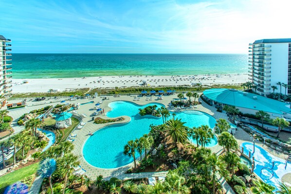 You won't want to leave Edgewater Beach and Golf Resort in Panama City Beach!  The resort is so extensive that you won't ever have to leave once you arrive and golf cart shuttles are provided to take you where you would like. With half a mile of private beach, eleven pools, four hot tubs and a fabulous 11,500 sqft. Polynesian-style, free form lagoon pool with waterfalls and fiber optic lighting, you can lounge to your heart's content!  Wander past the six reflecting pools to wind down your day. Beach service is available for a fee.
