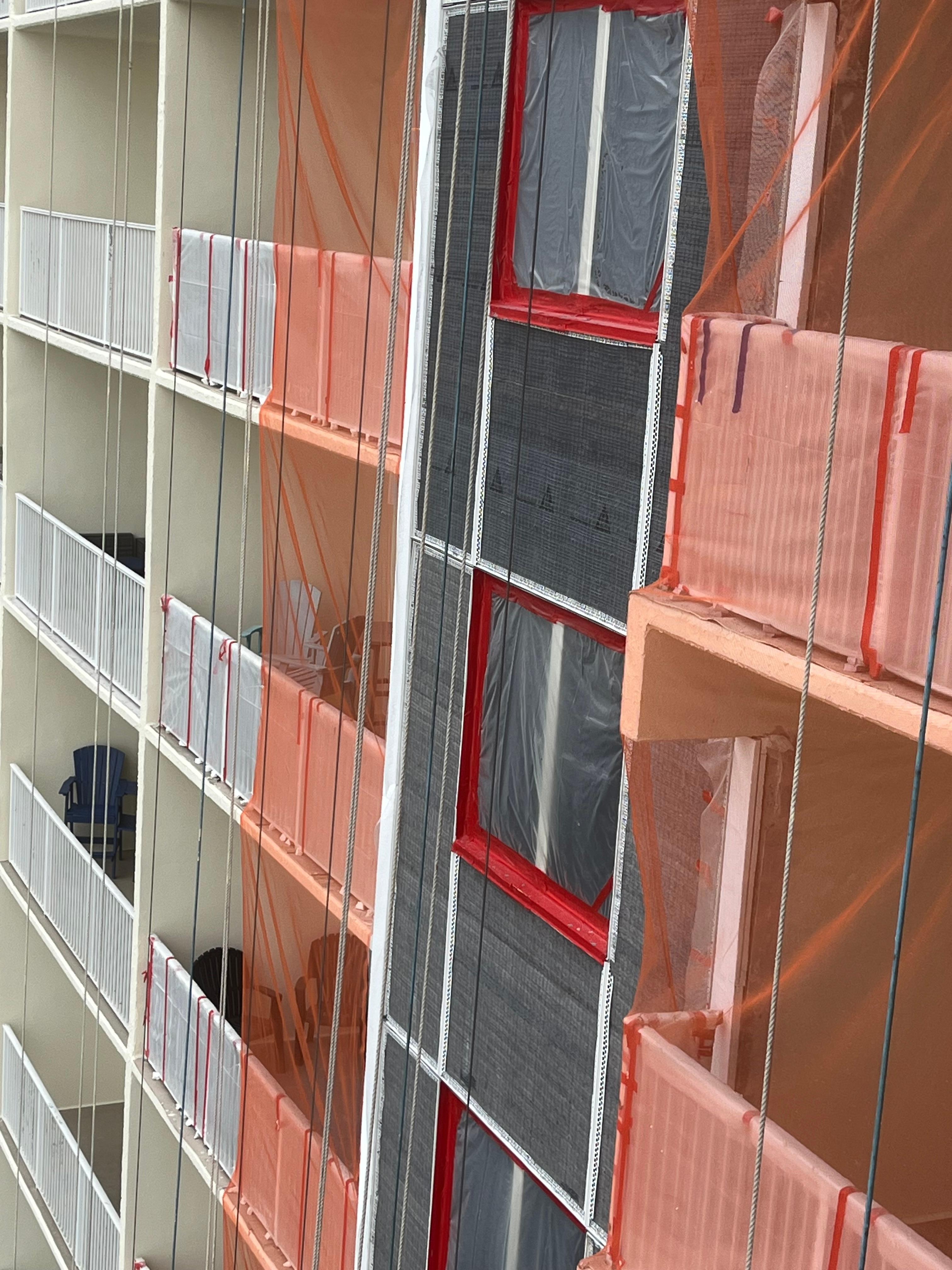 Construction update for Shores of Panama 1127: Currently scheduled through April 2026, balcony is open for use to guests, there is some obstructed view due to plastic covering railings and netting to catch stucco debris. There is some noise from grinding at the nearby Elevator tower reconstruction.