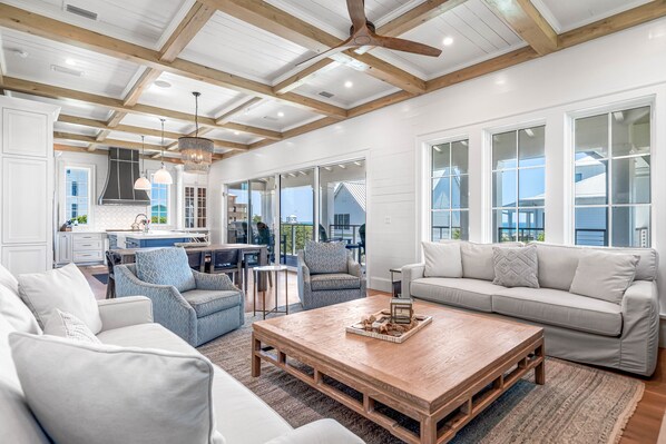 Head up to the second floor for endless views and more gathering spaces. The chef in your family will love the Wolf and SubZero appliances in the kitchen! Take advantage of the built-in grill with a view, located on the balcony. A powder room, large laundry room, and the third guest room (boasting a King bed and en-suite with a walk-in shower) are also located on this level.