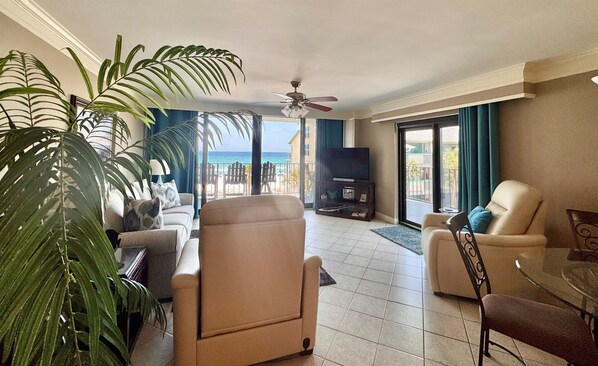 Questo condominio è davvero unico in quanto l'intero spazio abitativo è ricoperto da grandi finestre e porte scorrevoli in vetro, quindi ti senti come se fossi in piedi sulla spiaggia mentre sei in questo meraviglioso condominio. La camera da letto principale ha la stessa parete di vetro, quindi quando apri le bellissime tende personalizzate puoi sdraiarti sul letto e sentirti come se fossi sulla spiaggia. Entrando nel condominio il tuo respiro ti sarà tolto dalla vista! Il balcone MOLTO ampio può ospitare tutto il gruppo, sia per cenare, rilassarsi o guardare i meravigliosi tramonti! Anche WiFi gratuito.