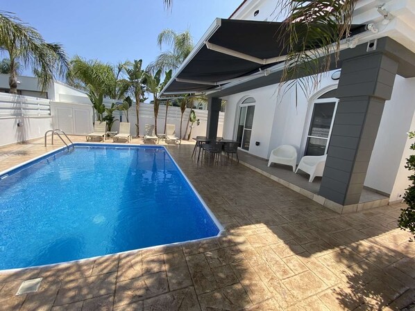 All'esterno i giardini che circondano la villa sono magnificamente piantati, aggiungendo un senso di calma e tranquillità alla zona. Ci sono quattro lettini sparsi per la piscina e un tavolo in legno e 6 sedie sono forniti per mangiare all'aperto. Una tenda da sole elettrica allarga l'area ombreggiata in caso di necessità di sollievo dal sole cipriota. Ci sono anche due tavoli quadrati, un ventilatore elettrico e barbecue a gas. Questa zona offre un ambiente intimo per godersi la proprietà e rilassarsi con la famiglia o intrattenere gli amici in privato.