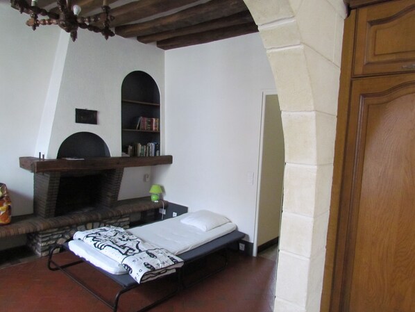 l'ingresso è attraverso il soggiorno. Piastrellatura vecchio stile con travi a vista e lampadario in legno a più rami. Una piccola decappottabile per due posti. Un camino decorativo, mensole e un ripostiglio. Affacciato sulla cucina dietro un arco in pietra. Cucina completamente attrezzata con un sacco di ripostiglio in stile "cappello gendarme" in rovere con linoleum. Grande piano di lavoro. Frigorifero integrato, piano cottura a gas a quattro fuochi. Forno elettrico Sink. Vecchio tavolo in legno massello e quattro sedie.