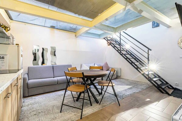 Cet hébergement propose une pièce à vivre agréable avec un salon spacieux comprenant des canapés convertibles, une cuisine ouverte entièrement équipée, ainsi que la salle de bain au rez-de-chaussée. À l'étage, découvrez la mezzanine avec sa charmante verrière, créant un coin chambre privilégié pour se ressourcer. Profitez d'un espace paisible avec une connexion Wi-Fi performante.