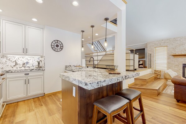 The townhome itself features stylish, modern furnishings, an open floor plan, hardwood floors, high ceilings, and abundant natural light. Spend warm mornings on the deck, enjoying the scenery, and chilly winter evenings snuggled up with a good book in front of the gas fireplace. The group’s chef will adore the sparkling kitchen, with high-end appliances, gleaming countertops, and all the gadgets they need to turn out a feast, and there’s plenty of mealtime seating around the large dining table.