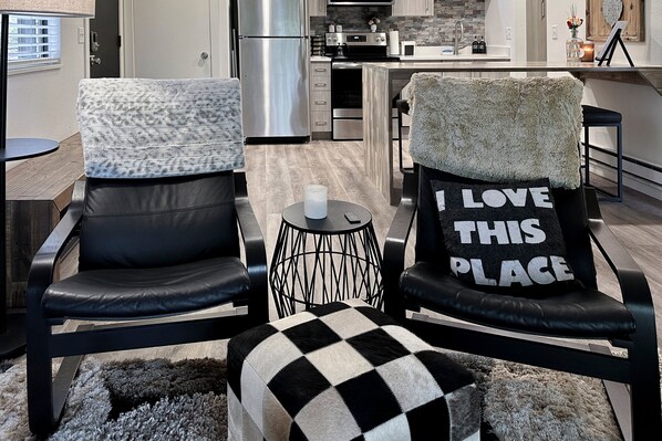 Dining: Gather around the modern dining table with seating for four.