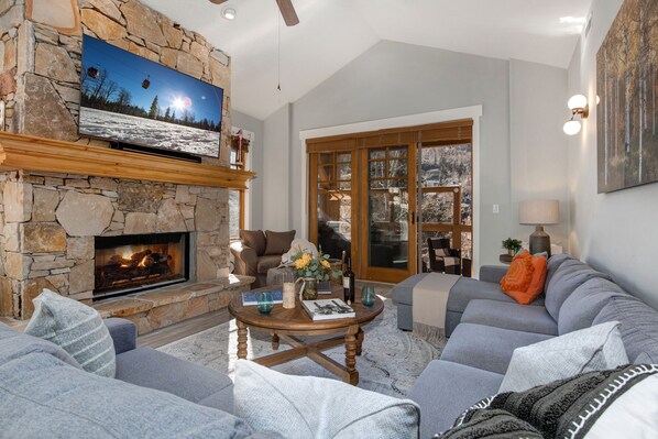 Living Room: This room boasts a plush, over-sized sectional, and a large Sony Smart TV. The adjacent private deck offers fantastic resort views, outdoor seating, BBQ, and a private hot tub.