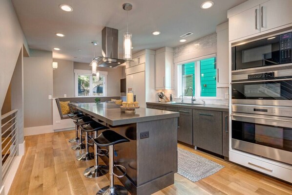 With two family rooms, a bunk room that sleeps up to six, three king bedrooms, and each bedroom with its own private bathroom, every detail in this home is thoughtful and comfortable. Enjoy your private backyard complete with hot tub that sits up to 8, a gas fire pit with cozy seating or enjoy sitting on the patio while grilling on the gas BBQ. If you chose to get your Chef on, this kitchen is for you! Wolf brand appliances and spacious kitchen allow you to create meals that would rival any top chef!