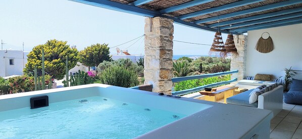 Nella camera da letto al piano superiore c'è un letto king size quando la seconda camera ha due letti singoli che si trasformano anche in una doppia. Entrambi hanno A / C e condividono un 40sq. M veranda con due divani in muratura, tavolo da pranzo e splendida vista sul mare (si può vedere l'isola di Naxos e guardare l'alba). C'è anche un bagno con vasca al primo piano.