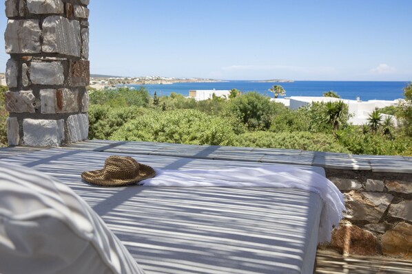 Avrai l'uso esclusivo del suo ampio giardino pieno di alberi e piante aromatiche. La grande terrazza ombreggiata del residence e un letto matrimoniale costruito dove potrete rilassarvi giorno e notte e godervi il magnifico panorama sul mare e Paros o mangiare qualcosa e bere qualcosa durante le dolci serate estive. C'è anche un grande barbecue che i nostri residenti adorano usare per cucinare con le erbe raccolte dal nostro giardino. Se ci sei tra luglio e agosto, non dimenticare di prendere alcuni dei tuoi fichi, sono assolutamente deliziosi.