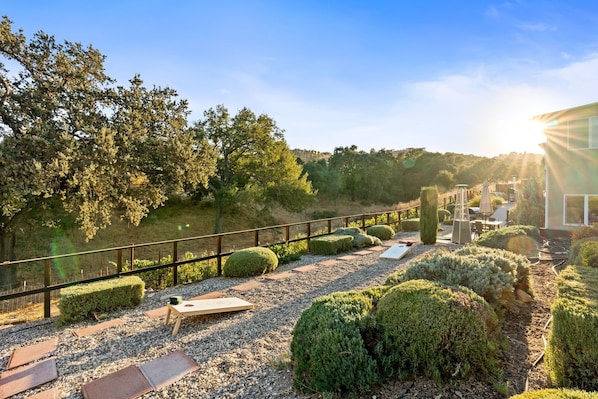The private patio is equipped with cornhole, a gas grill, outdoor dining area, and a fire feature — perfect for enjoying long evenings under the stars. Located within walking distance of downtown Paso Robles, you can visit the Pasolivo Tasting Room for an authentic California olive oil experience, or even tour their farm during your wine tasting adventures. Guests also enjoy access to on-site laundry facilities for convenience during their stay.
