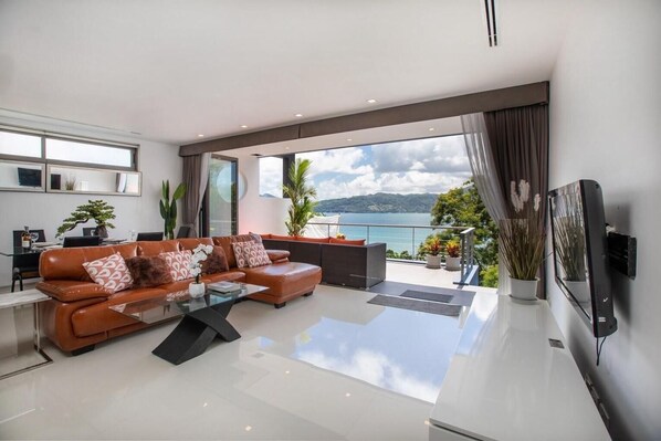 Il salone ha ampio pannello porte che consentono agli ospiti di sedersi sul comodo divano e ammirare le splendide viste sul Mare delle Andamane scorrevole, il divano è e di grandi dimensioni a forma di L, in grado di ospitare comodamente fino a 6 persone. Intrattenimento si presenta sotto forma di una grande TV a LED, una vasta scelta di canali internazionali satellitari, lettore DVD e anche Wi-Fi internet. Porta-finestra della stanza Il soggiorno si aprono sulla terrazza della piscina per permettere una fusione di vita dentro e fuori, sempre e solo uno sguardo di distanza della frizzante dell'oceano Andman.