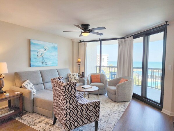Crescent D4C - Gorgeous views of the fountain lagoon, swimming pool and out to the beach and ocean from this 4th floor condo at The Crescent. Featuring 3 bedrooms, 3 baths. All new furnishings and updates and renovations throughout! The open plan living, dining, kitchen areas offer views of the ocean. The living area opens to the covered balcony where you can sit and relax with your morning coffee, or watch the sun rise in the morning and the moon rise in the evenings. The dining table can seat up to 8 and there is a breakfast bar that seats 3. The kitchen has new appliances, and it has already been updated with beautiful leathered granite countertops and a counter height breakfast bar. Bedroom 1 has a king bed and a sliding door that opens to the balcony and view. The private bath is renovated with a vanity with two sinks, and large walk-in shower with glass enclosure. There are two more bedrooms and two baths. Both baths have a tub/shower combination. Bedroom 2 offers a queen bed, Bedroom 3 has a Bunk with a single over a double bed. For additional sleeping arrangements, the living area has a sleeper sofa with an extra long double. Other amenities include Keurig Coffee Maker, Secure Internet, Multiple TVs, and Ceiling Fans. Guests can enjoy the Sandpiper Run & Crescent amenities including the large pool complex with cabana and hot tub as well as the Litchfield by the Sea amenities including tennis/pickleball courts, miles of jogging/walking/bike paths, fishing lakes and more!