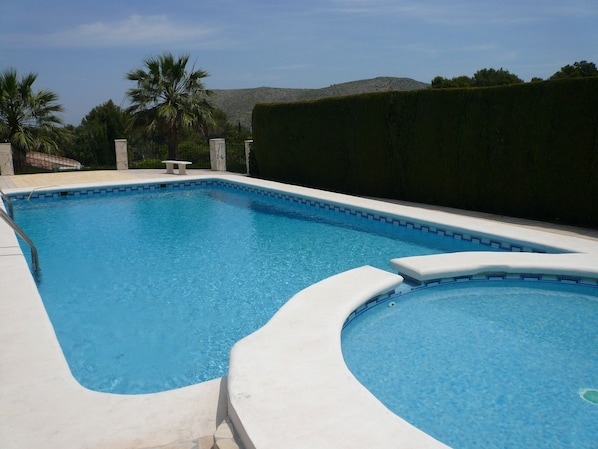 La piscina ha una estremità profonda ideale per le immersioni, e abbastanza grande per le lunghezze del nuoto, con una piscina per bambini aggiuntiva. Plus terrazze ideali per prendere il sole e una doccia rinfrescante.