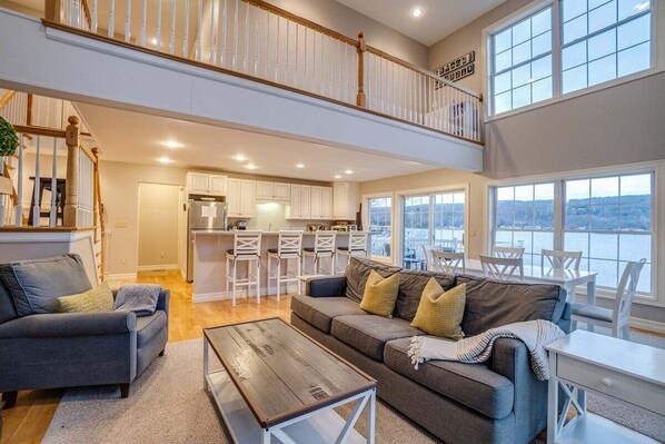 On the main floor is an open living space with large kitchen, dining area and Living room. The Kitchen is stocked with cookware and dinnerware and has a large island for additional dining. The Living room has comfortable seating, a tv, and patio doors out on the small side patio where the gas grill is located (the interior fireplace in the living room is not in working condition and cannot be used by guests). From the dining area, there are large windows looking out over the lake, making it easy to dine while enjoying the views of the water. The patio doors from the dining area go out onto a small balcony where you can enjoy a few moments of quiet in the rocking chairs.