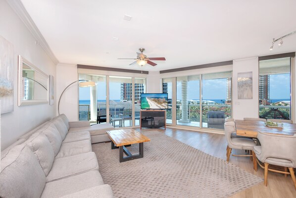 Every room in this Sky Home features a water view, and no Sky Home sits below the fifth floor—ensuring elevated privacy and scenery. Exceptionally spacious, each residence is at least twice as wide as a typical beach condo and designed for comfort and relaxation. The home includes a custom upgraded kitchen and bathrooms, walk-in shower, washer and dryer, dishwasher, and generous closet space stocked with extra linens and pillows. Each bedroom has its own private full bathroom, plus an additional half-bath for common-area use.