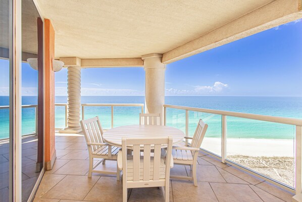 The fully-equipped kitchen has granite countertops, stainless steel appliances, and ample space for preparing delicious meals. Enjoy your meals at the dining table, or take advantage of the expansive private balcony, where outdoor dining and a built-in grill allow you to enjoy meals while soaking in the gentle Gulf breeze and stunning sunsets.