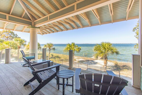 We stayed with family and friends for my daughter’s UWF graduation weekend. It was the perfect house for a multi-generational group with ground floor rooms for the older folks and a porch and common room with multiple beds for the younger folks to have their own space. The outdoor patio space had lots of seating and the outdoor enclosed kitchen was fantastic for when the weather turned cold and windy during our BBQ. The views of the sound were lovely and we saw dolphin every day. The house was well equipped for our needs and it seemed to have just had an update. A great time was had by all!