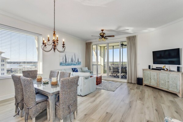 This 10th floor end unit is beautifully decorated & filled with natural light and beach touches throughout. There are AMAZING views! The living area features a spacious sectional sofa, large flat screen TV & balcony access! The large screened balcony overlooks the golf course & also provides views of Old River & the surrounding waterways. The balcony is the perfect place to enjoy your morning coffee or evening glass of wine. Not to mention ending your day with a spectacular sunset over the bay! The open concept of the unit allows for easy entertaining. The dining room & breakfast bar seats 9 comfortably. The kitchen is fully equipped with granite countertops, tons of counter & storage space & modern appliances.
