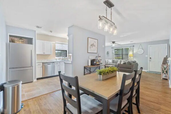 Our home (renovated in May) sleeps 7 with 3 new Queen beds and twin size cot with 10" Lucid mattress. Our home is tastefully decorated with charming touches and comfortable new furniture to enjoy. The kitchen is fully stocked with all the amenities you need to make that home-cooked meal for the family. Enjoy dinner together in our dining room space adjacent to the kitchen. In-house laundry is also available for your convenience. Come and enjoy the Gulf of Mexico and all that Pensacola has to offer!