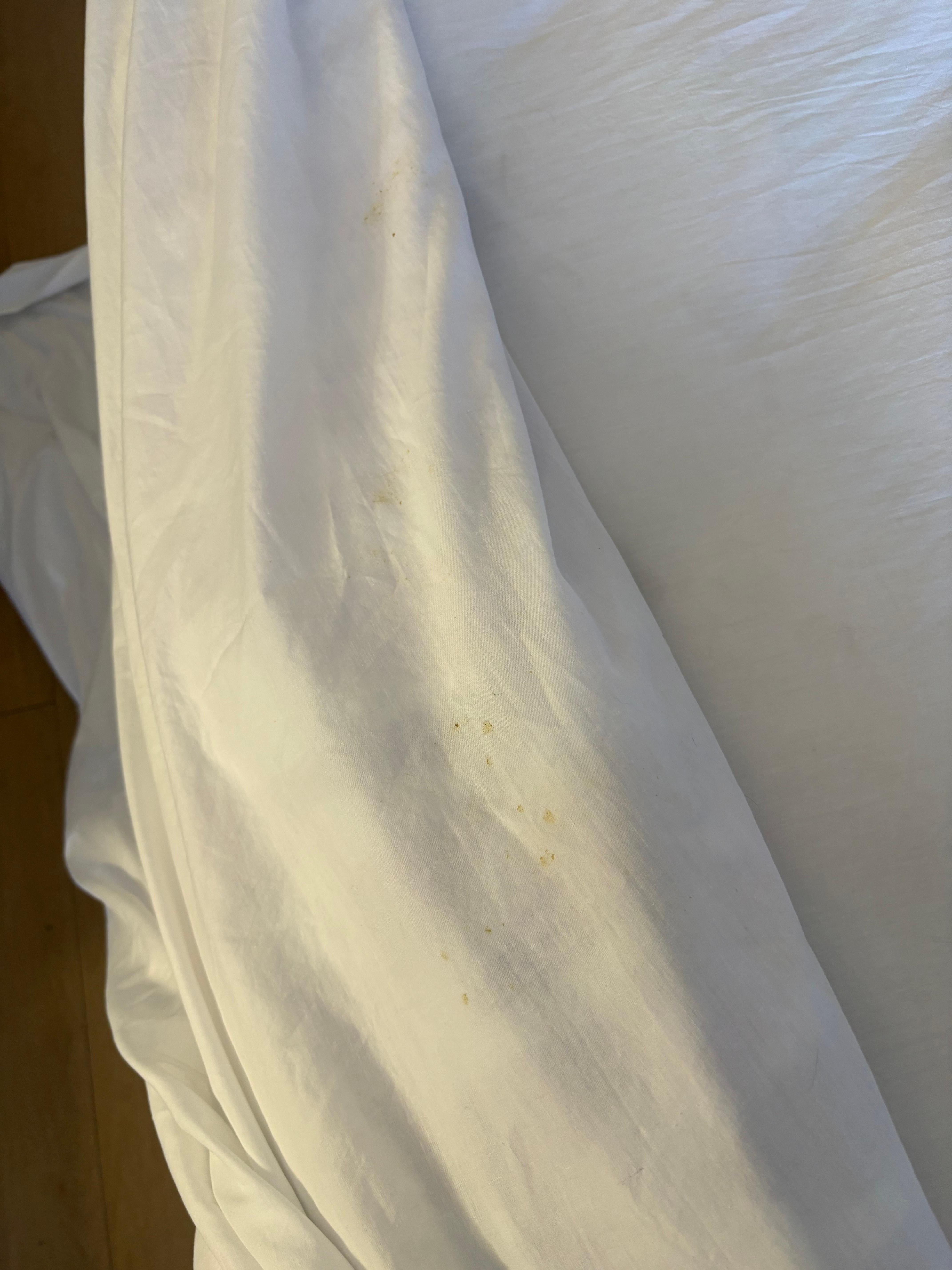 The sheet had an old urine stain that I didn't see until the morning. I was so tired and the room was dark at night so I didn't see it until the morning. I took a picture