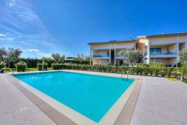 In grado di ospitare fino a 5 persone, questo appartamento con una camera da letto offre una piscina all\'aperto e un giardino in comune, accogliendo famiglie con bambini, anziani e animali domestici per una vacanza deliziosa. L\'appartamento dispone di un giardino privato e di una terrazza privata con divano, poltrone e tavolino, ideale per crogiolarsi al sole e gustare i pasti all\'aperto. All\'interno, il moderno appartamento presenta una zona giorno ben arredata con interni eleganti e dotata di un divano letto e di una smart TV. Adiacente, c\'è uno spazio per pranzare e una cucina aperta con elementi essenziali come piano cottura a induzione, lavastoviglie, forno, frigorifero e congelatore, per garantire che tutte le avventure culinarie siano ben preparate.