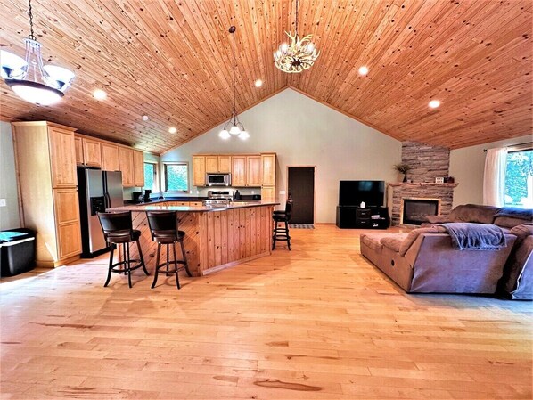 Bring the whole crew to this beautiful place with lots of room for fun! This lake house is on the chain of lakes with water frontage access via a private cove with the ability to dock most boats. Find beaches, sand bars, restaurants, and great fishing throughout the 4-lake chain. Drive your snowmobile or ATV/UTV right out the driveway to be on trails with a garage to store your machines overnight.