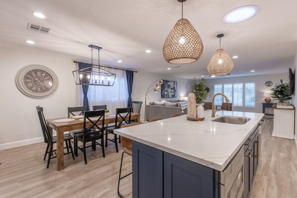 This beautiful kitchen features modern design, quarts island with seating, and stainless steel gas range with griddle. Fully stocked kitchen has everything you need including, blender for drinks or smoothies, child friendly plate/bowl/cup options, bakeware, stylish dish-ware, utensils, fun mugs, kuireg, stainless steel pots and pans, dishwasher, microwave. Complimentary coffee, tea and snacks.