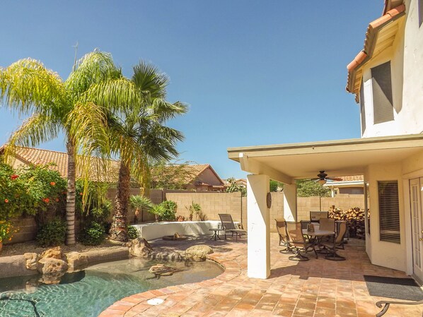 Il cortile è una bellissima oasi con una piscina di ciottoli, cascata d'acqua, luce della piscina per la notte e un canestro da basket. La piscina NON È RISCALDATA. La piscina è circondata da un ampio patio finitrice con copertura del patio, confortevole zona pranzo, pozzo del fuoco e barbecue a propano Weber. C'è un capannone sul lato della casa nel cortile che ha giochi da piscina, galleggianti, biciclette, ecc.