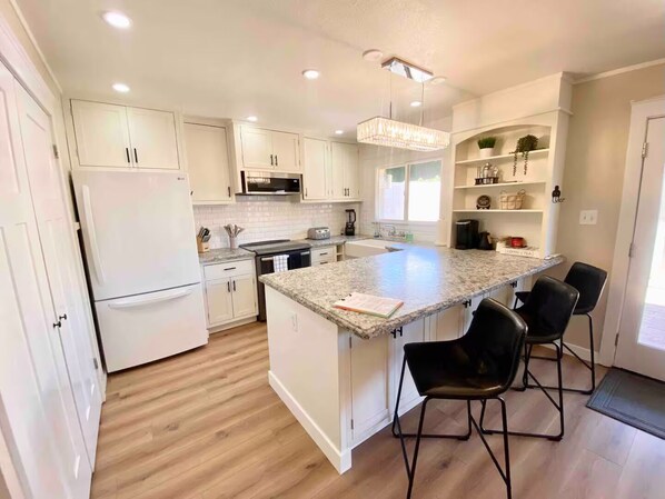 KITCHEN: Pots, pans, plates, bowls, cutlery, Keurig, kettle, blender, and more! Use to save your travel funds by cooking your own meals in this spacious and well equipped kitchen!