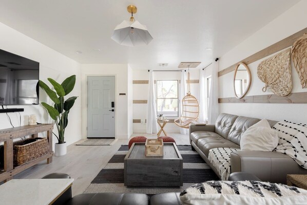 Our home welcomes you with a beachy and bright living room upon arrival. The house features a master bedroom with a king bed, an attached bath with double sinks, and a glass shower. The secondary bedroom boasts a comfortable queen bed. And in the third bedroom, two bunk beds, great for kids or additional guests. There is a new futon bed located in the third bedroom, accommodating 7 guests total. Enjoy the convenience of garage parking and a private driveway!