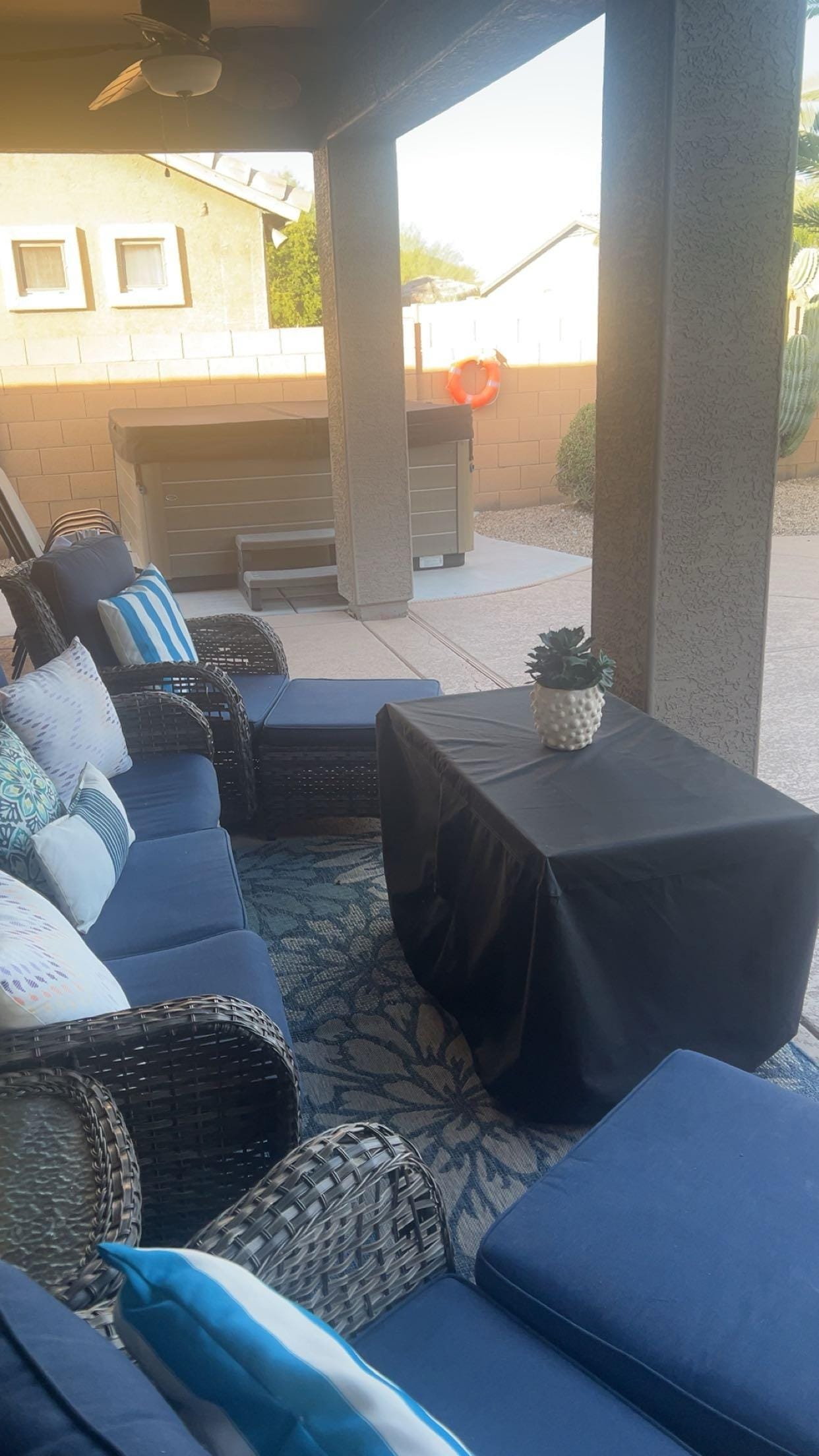 - Patio, lounge seating, pool chairs & fire table