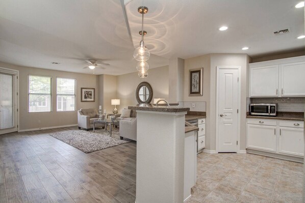 Make yourself at home in our immaculate resort style 2 bedroom, 2 bathroom condo in a gated community with garage parking for two vehicles plus direct access to the condo. Enter the condo on ground level and walk up a flight of stairs to find an open floor plan and a complete remodel. All the beautiful designer touches make this condo really stand out. The kitchen has a microwave, dishwasher, fridge, stove/oven, Keurig coffee maker and also a tradional coffee maker and items to prepare your meals and a dining area seating for 6 plus 2 barstools at the kitchen counter. The cozy living room has a sleeper sofa for additional sleeping and 2 chairs along with a custom gas fireplace and a flat screen 55" smart TV w/ Youtube TV Live. Step outside onto the balcony just off the living room that has outdoor seating and dining on those beautiful Arizona mornings or evenings.