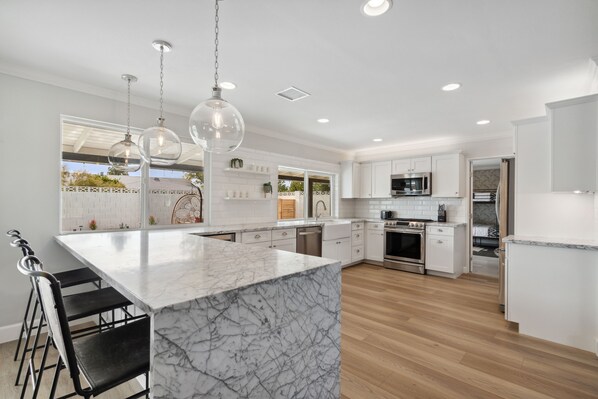 This kitchen is absolutely STUNNING! Sleek, modern, and so functional! Brand new modern appliances (including a wine fridge), coffee station, and opens right up to the rest of the entertaining space. Right across from the kitchen is the dining room, with seating for 8 and direct access to the backyard.