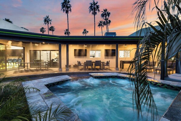 Unwind on the covered patio with misters, play ping pong or foosball, and relax by the custom pool or oversized hot tub. With plenty of seating and two outdoor TVs, it’s the perfect spot for fun and relaxation. Enjoy high-speed WiFi, contactless check-in, a heated pool and spa, BBQ, and easy access to Scottsdale’s best attractions—combining luxury, comfort, and convenience.