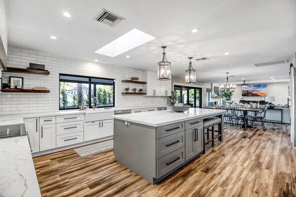The fully equipped kitchen is a chef's dream, featuring stainless steel appliances, ample counter space, and a large island with bench seating for casual meals or gatherings. The adjacent dining area comfortably seats eight, making it perfect for family meals or game nights.