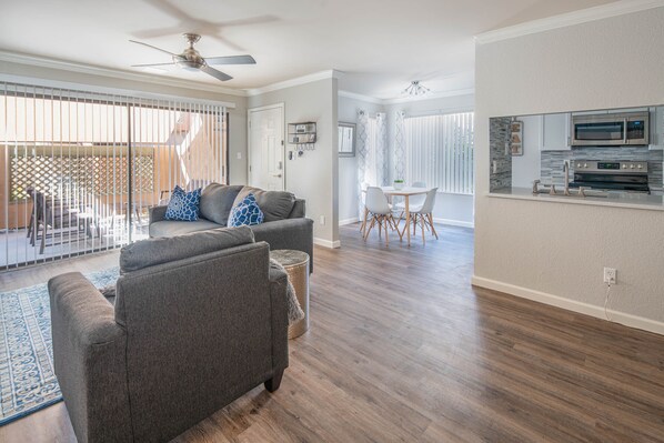 This is a first-floor unit and is single-level with a large private patio with a retractable sunshade. The master bedroom has a king bed, six drawer dresser, and a spacious closet. The living room has a comfy sofa, accent chair, workspace desk with chair, and 55' smart TV with Roku OS.