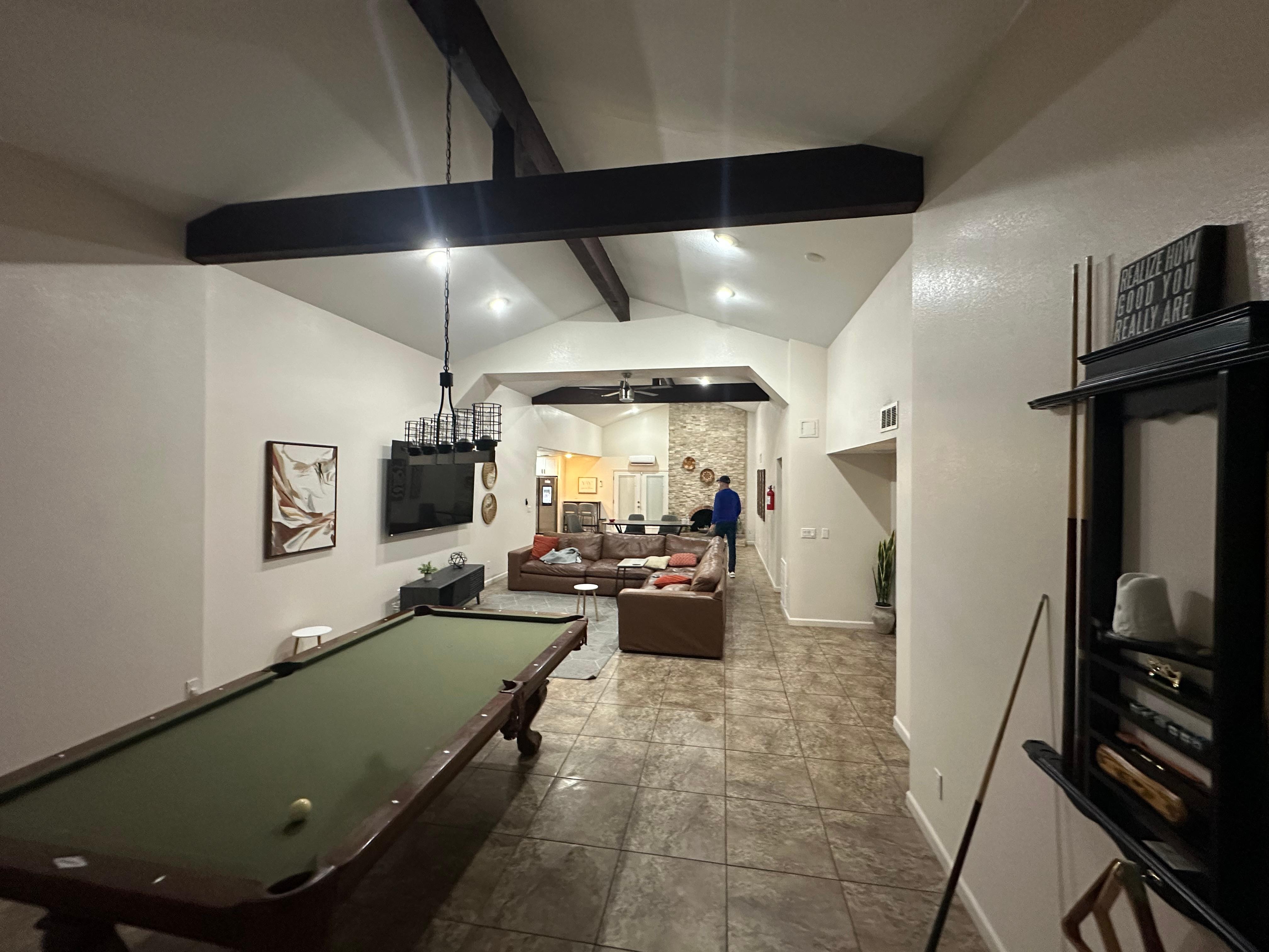 The heart of the home is a spacious billiards room, complete with a centered pool table, flowing into a spacious living room with a wall-mounted 85" SmartTV, and a massive leather sectional - perfect for those restful moments in between games or family movie night!