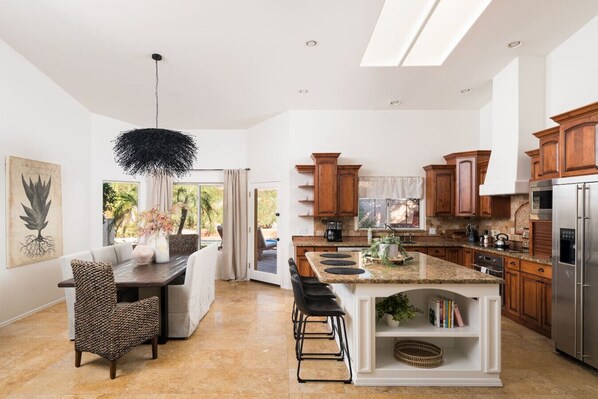 Enjoy this two-story, 3,380 Sq Ft Mediterranean-style villa in a quiet neighborhood surrounded by multiple desert preserves. This ultimate vacation destination for all-size groups has everything you need to entertain your guests house within a variety of indoor and outdoor gathering spaces. Serve a feast for a gathering or an intimate meal for two in our gourmet eat-in kitchen. Or enjoy some summer bites cooked on our built-in grill.
