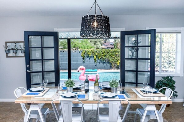 The private backyard is designed for gathering and unwinding. Cool off in the seasonal pool (not heated) or stretch out with pool toys provided. A hot tub is available year-round, perfect for unwinding after a day exploring Scottsdale. Fire up the BBQ grill, settle into the outdoor furniture, or gather around the fire pit in the fully fenced yard.