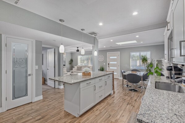 The open-concept kitchen has new cabinets, stainless steel appliances, granite countertops, interior LED lights, LED ceiling fans, top-bottom blackout blinds, & fully finished two-car garage (with separate AC/heat). Both bathrooms are fully remodeled.