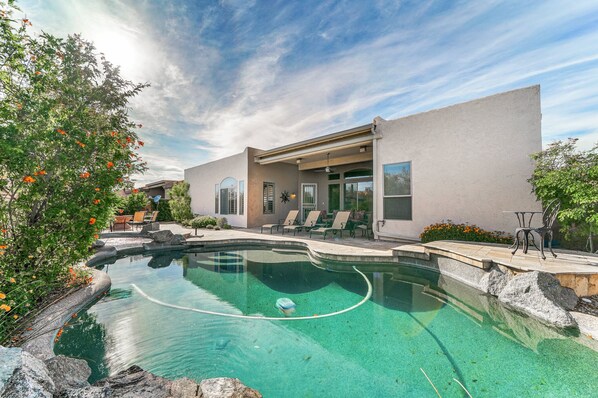 Pinnacle Monte Estate si trova in un lotto Cul-De-Sac e ha un muro di privacy che corre lungo la sezione sud e ovest del cortile insieme a una recinzione che corre lungo il lato est del cortile - con una splendida vista sul deserto. L'esposizione a sud del cortile consente di ricevere sole tutto il giorno!