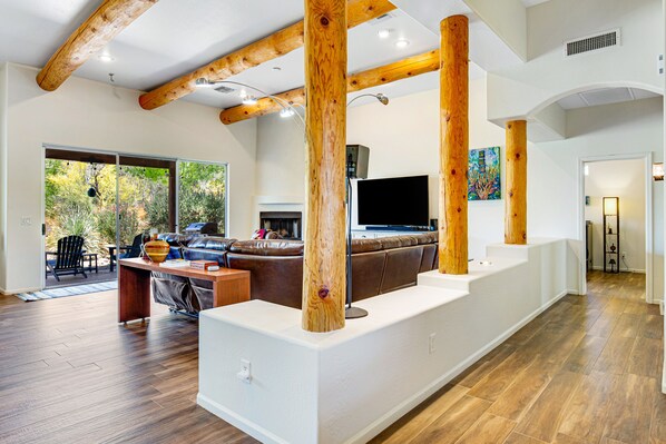 Inside this gem, you'll find tall ceilings with beautiful exposed beams. The large windows offer plenty of natural light to make this home feel truly warm and welcoming. Featuring four generously sized bedrooms, there's room for the whole family. The kitchen is fully equipped with stainless steel appliances and everything you'll need during your stay. Enjoy a home-cooked meal with the family around the dining room table or cozy up on the couch and stream your favorite movie, courtesy of the smart TV.