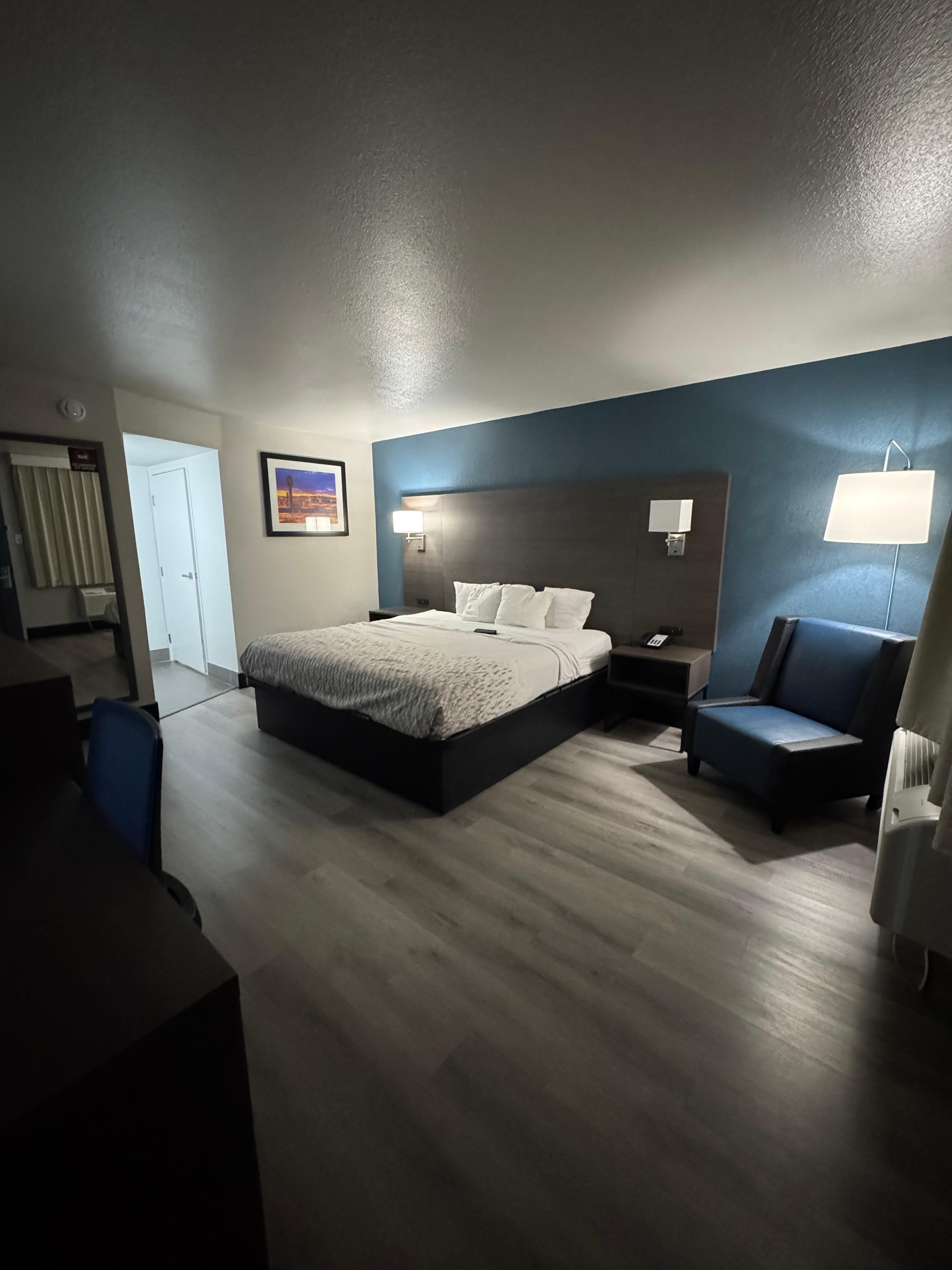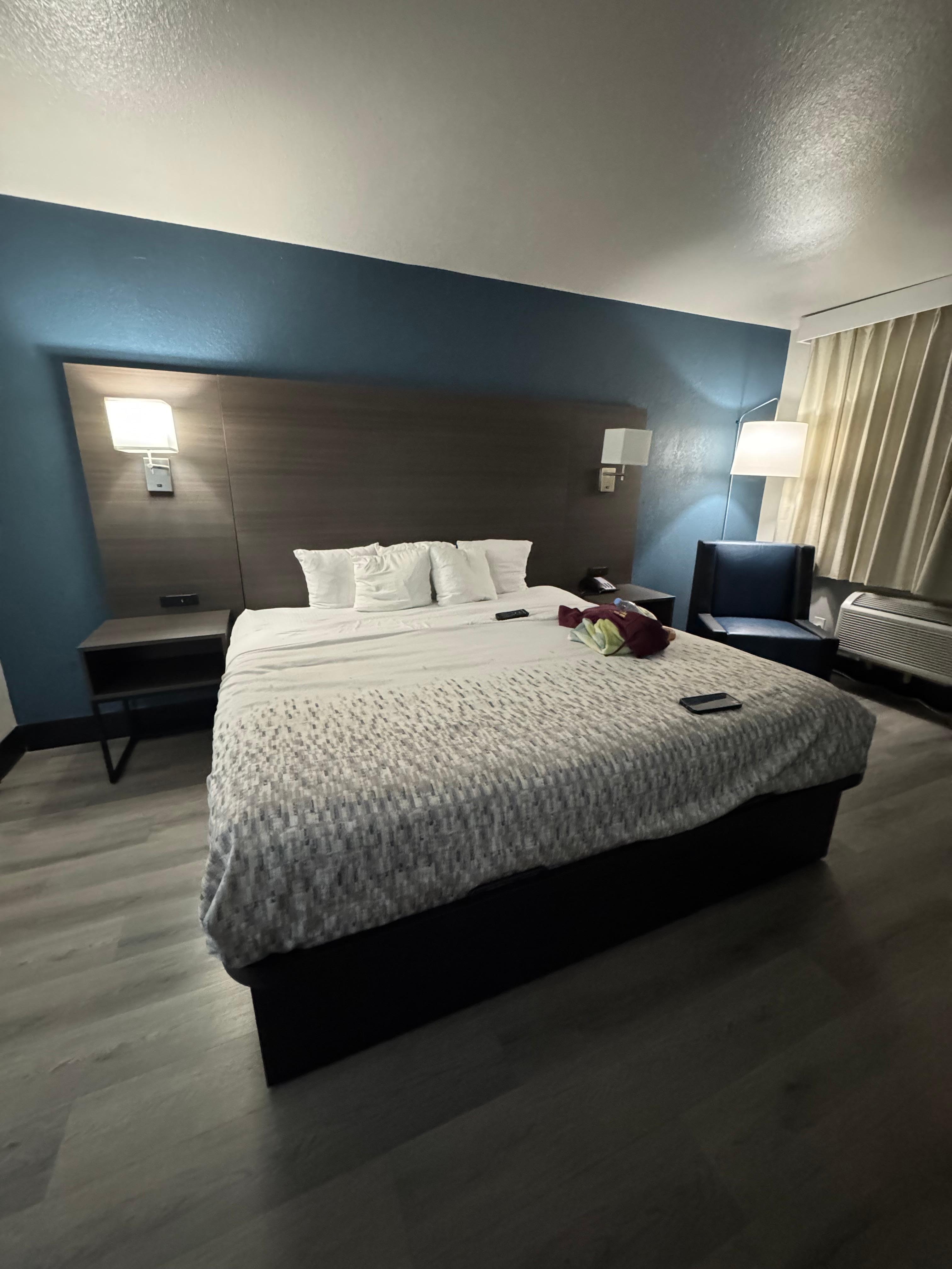 I flew into phoenix, as I am driving towards the property I start to notice the area is a bit sketch. I then see the property and start to question where I had reserved my stay. As I am checking in the young man at reception is not friendly. On the wall behind the reception there are all these signs like; No one within a 45 mile radius will be allowed to check in, no one other than guests in guest rooms and breakfast cannot be taken to rooms, that was amongst other signages. I get checked in. Big mistake! When I first walked into the room, I got some kind of strong scent, like those cheap car air fresheners. I called the front desk and the manager was sent to the room. Manager came, I had asked if they could remove the air freshener that was in the room and said she could not smell anything. The three solutions she offered were having housekeeping mop with just water, spray Febreeze or remove filters from AC unit. I asked if I could open the window, she said yes, that there was an additional lock on the window for safety. That was it. By that time my throat and head started hurting. I left for an event and never went back. I had a medical emergency and would have been far worse if I would’ve had to stay there. While I was elsewhere I reserved at an alternative location about 30 minutes away in Peoria. I do not recommend this place if you have scent sensitivity or allergies. If you are used to more higher class stays, this is not the place for you. Motel not hotel vibe.