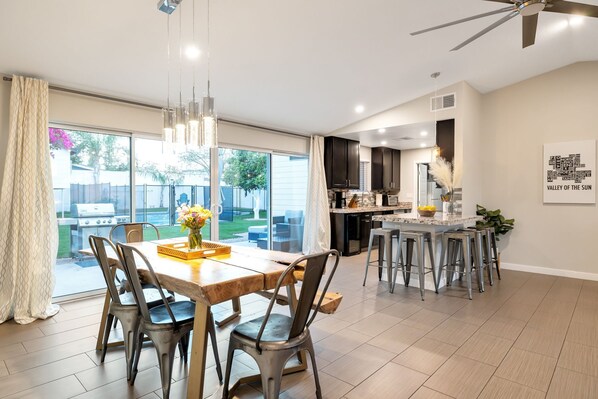 >Main house (1,717 square feet) with kitchen built to gather with granite countertop island and high top seating for 3. Fully stocked space with all newof the utensils and equipment you need. Smart refrigerator and wine fridge plus extra refrigerator and deep freezer.