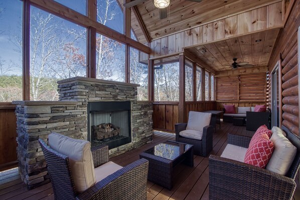 Down to the lower level where all the action is! Guests will find a game room that offers a cocktail table multicade , 2 upright multicades , a TV, and a set of luxurious queen bunk beds. The sliding glass doors offer convenient access to the lower level screened porch that features a relaxing hot tub and elegant outdoor seating area. The screened porch offers access to the outdoor gas fire pit with ample seating to create wonderful memories while making smores or soaking up the delightful sights and sounds of nature. This area also features a custom made corn hole game for hours of non-stop fun. The theater room offers a large TV, Sound Bar System, and 6 reclining theater seats with drink holders. This level also features a bedroom offering a plush queen bed, TV, ceiling fan, and access to the deck via the sliding glass door. There is also a full bathroom that offers a glass enclosed tiled stand up shower. The INDOOR POOL ROOM is located on this level and offers a heated private pool with water fountain and changing colored lights, a glass roll up door for access to the deck, blue tooth enabled speakers for listening to your favorite music and lounge pool seating. A closet houses a stacked washer/dryer for guest convenience. Whether you want to enjoy playing on the three multicades, relax in the theater room and watch a movie, or take a dip in the pool, this cabin has it all! Bring your favorite snacks and don't forget the popcorn!