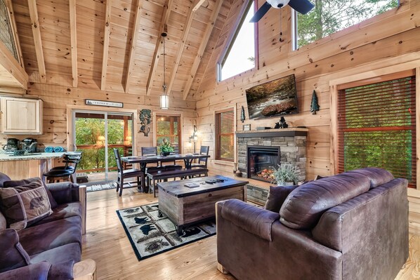 Cedar Station is a custom 2019 log cabin set in Alpine Mountain Village, just 1 mile to the Pigeon Forge Parkway, about 10 minutes to Dollywood, and roughly 17 minutes to Gatlinburg. Spend the day exploring, then come home to quiet woods, two covered porches, a private hot tub, a cozy fireplace, and a full game room. You’re close to everything, yet it feels peaceful and tucked away.