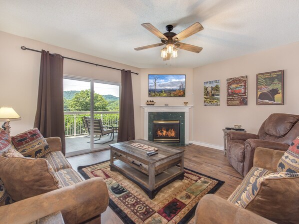 Step inside to find a thoughtfully designed living space with rich wood accents, plush leather furnishings, and a cozy corner fireplace. Whether you're unwinding after a day of adventure or gathering for a movie night, the spacious living room provides the perfect ambiance. A queen-size sleeper sofa offers additional accommodations for extra guests. The adjacent dining area is ideal for sharing meals or playing board games, while the fully equipped kitchen includes modern appliances, cookware, and all the essentials needed to prepare home-cooked favorites. Step out onto the private balcony to take in the scenic mountain views while sipping your morning coffee or enjoying a sunset meal at the outdoor patio set.