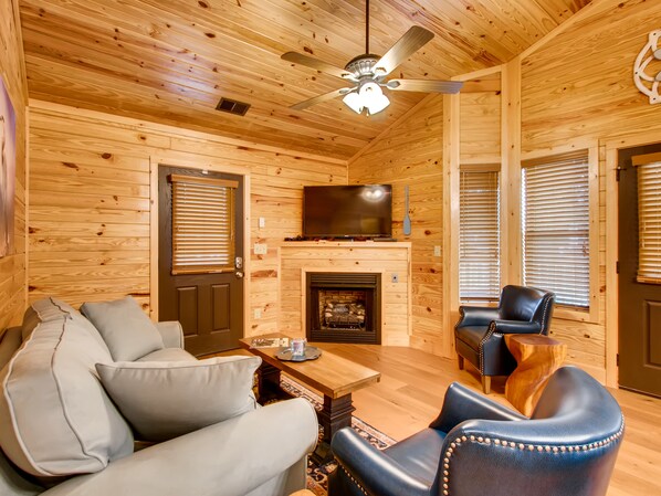 Questo 1 camera da letto, 1 bagno cabina che può ospitare fino a 4 è tutto 1 livello. Ci sono 8 passaggi per raggiungere il livello principale della proprietà. Troverete una cucina completamente attrezzata con sala da pranzo per 2, una zona soggiorno con un divano letto queen-size, 2 sedie, un camino a gas in pietra e una TV a schermo piatto. C'è anche una camera da letto King con TV a schermo piatto, con un bagno privato con una grande vasca idromassaggio / doccia combo. C'è anche una lavatrice e asciugatrice impilabile.