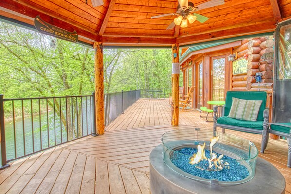 Il ponte di collegamento al livello principale offre un bellissimo gazebo con posti a sedere nel patio e un pozzo del fuoco. Ci sono 2 grill e 2 vasche idromassaggio, perfette per rilassarsi e distendersi dopo una lunga giornata di visite turistiche e sperimentare tutto ciò che la zona ha da offrire. Ci sono gradini che portano fuori dalla proprietà fino al fiume per un facile accesso, pesca, nuoto o tubi sul bellissimo fiume Pigeon.