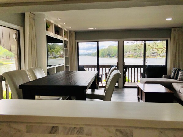 Living room views are gorgeous…but, also include full length linen curtains should you like. The 65 inch flatscreen tv can be seen from the patio, living room, dining table, and kitchen in order to easily watch a movie or your favorite sporting event. All TVs provide basic cable and Golf Channel and are smart tvs in case you’d like to watch programming from your own apps. We've included a PS4 game station with two remotes and DVDs (they play from the PS4) should you like to watch a DVD movie.
